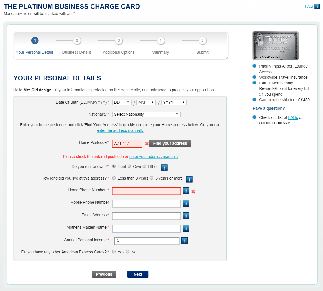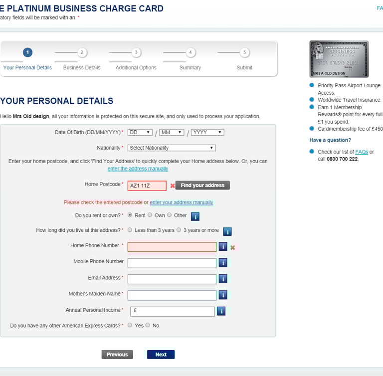 Redesign the international business card application process to reduce drop-off rates by addressing usability, accessibility & legal issues, modernizing design, and optimizing user flow across devices.